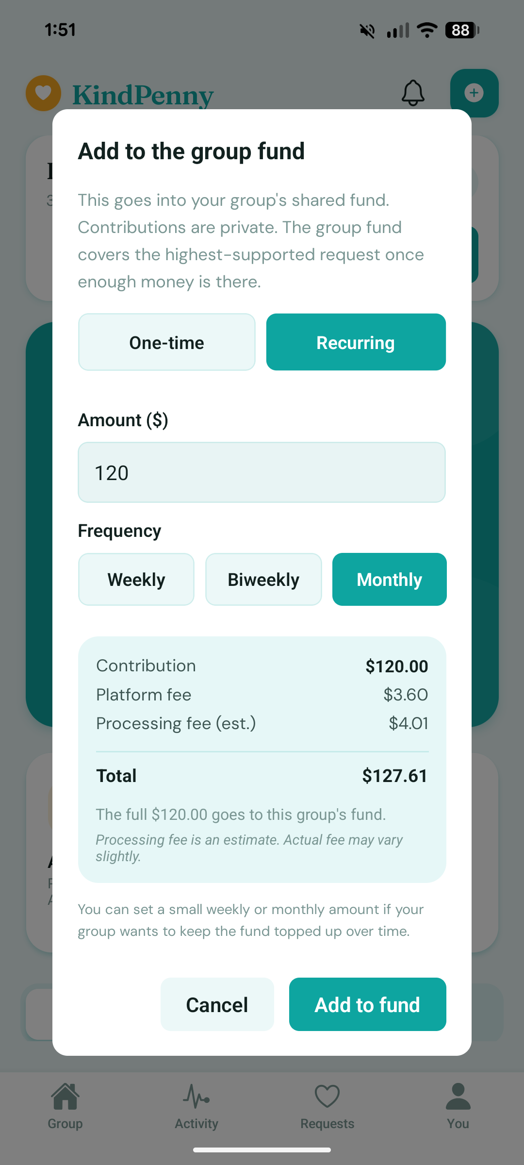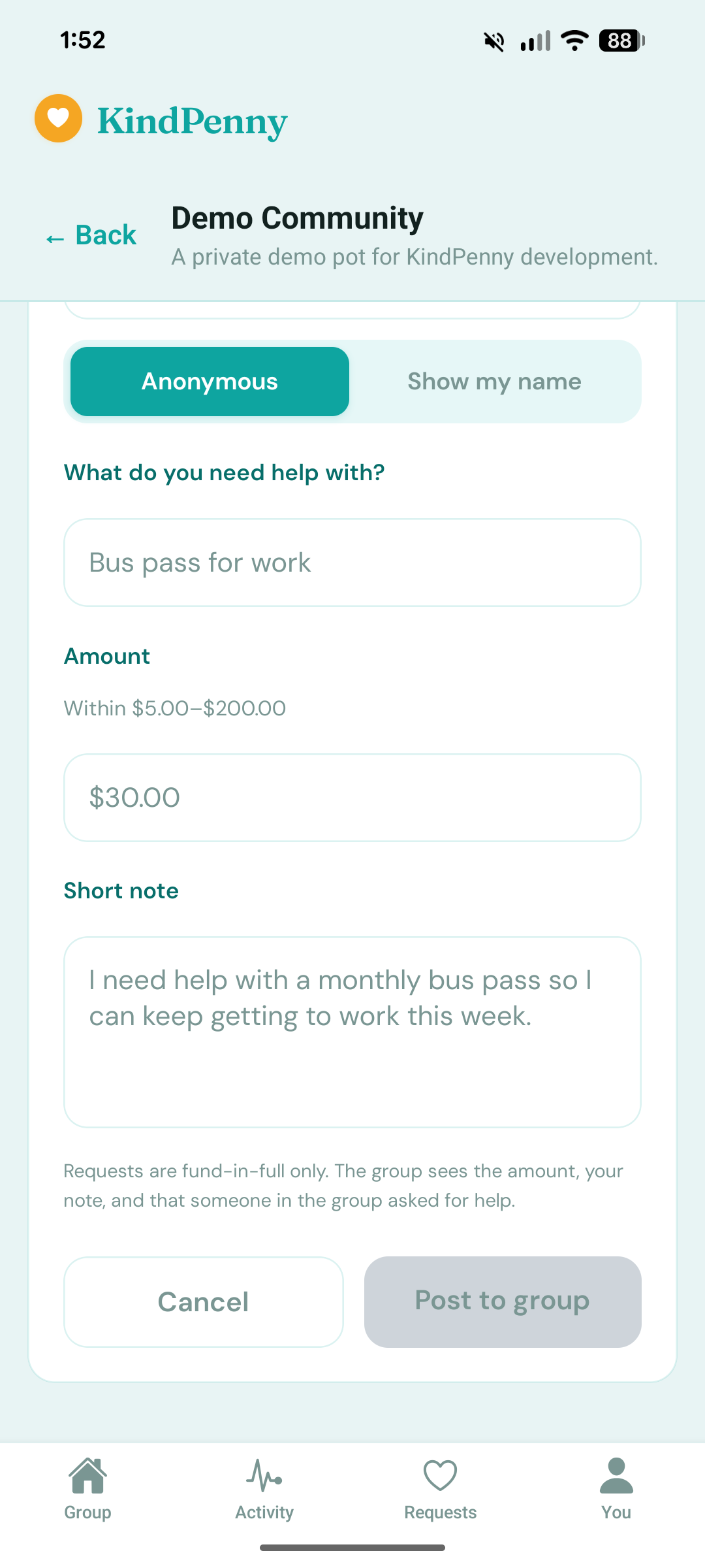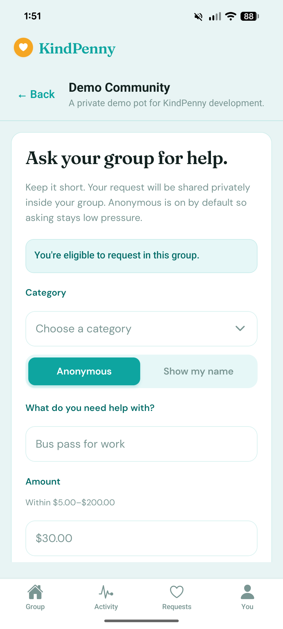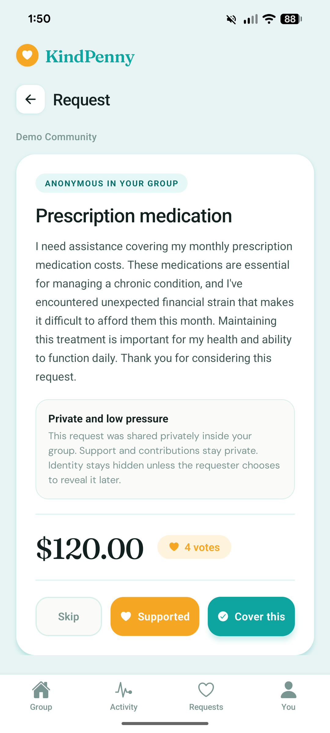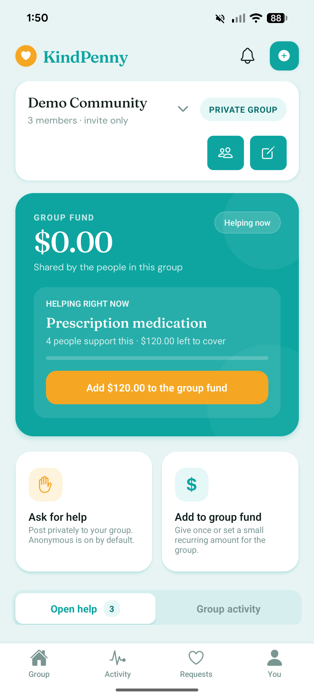 KindPenny is not crowdfunding and not charity. It is micro-support for people who already trust each other: requests, support from the group, and one shared pot that fulfills the top eligible need as soon as it can.