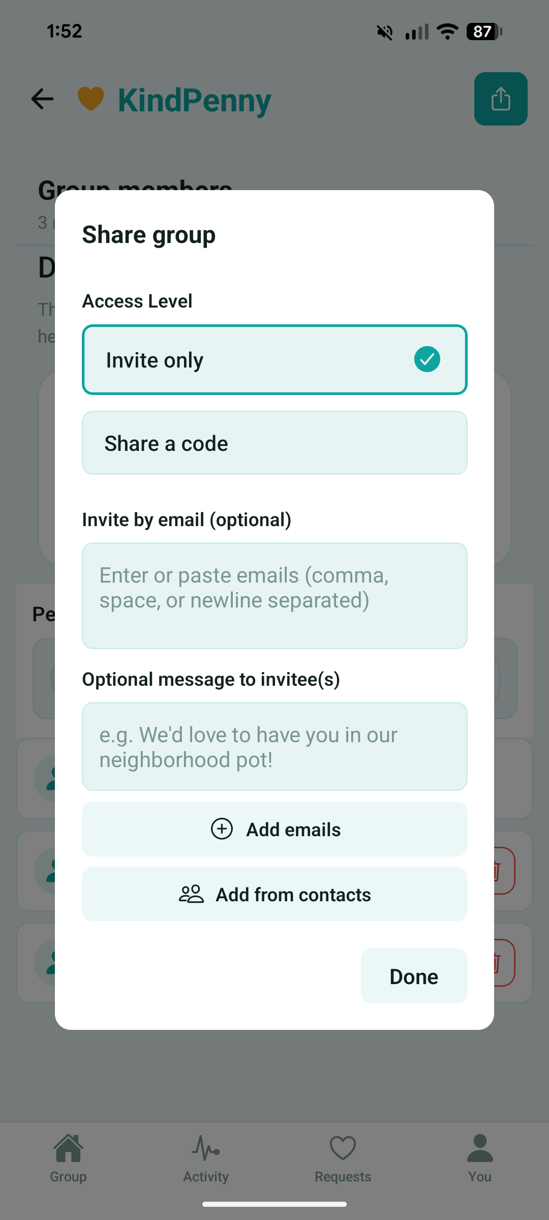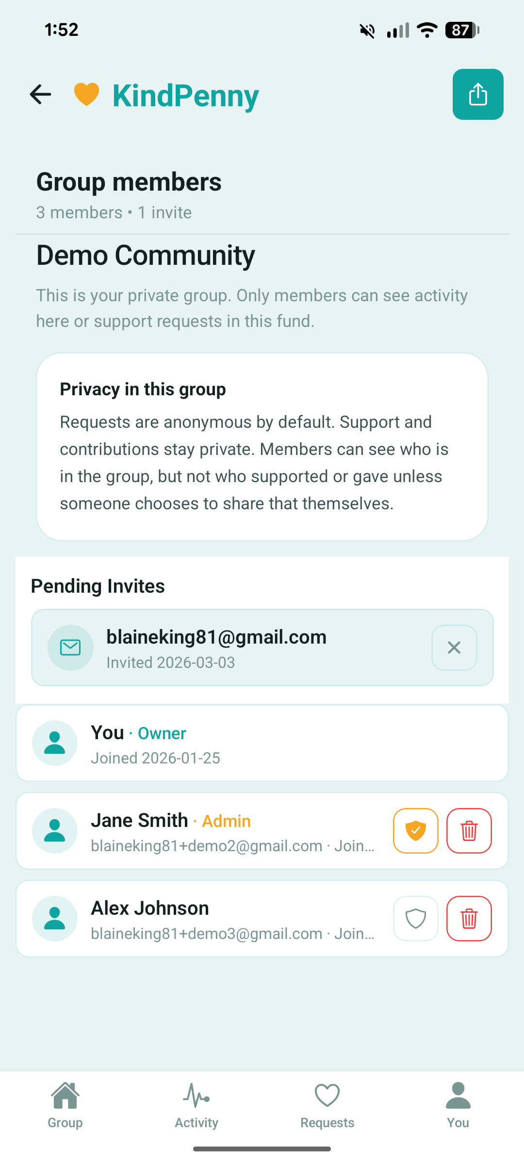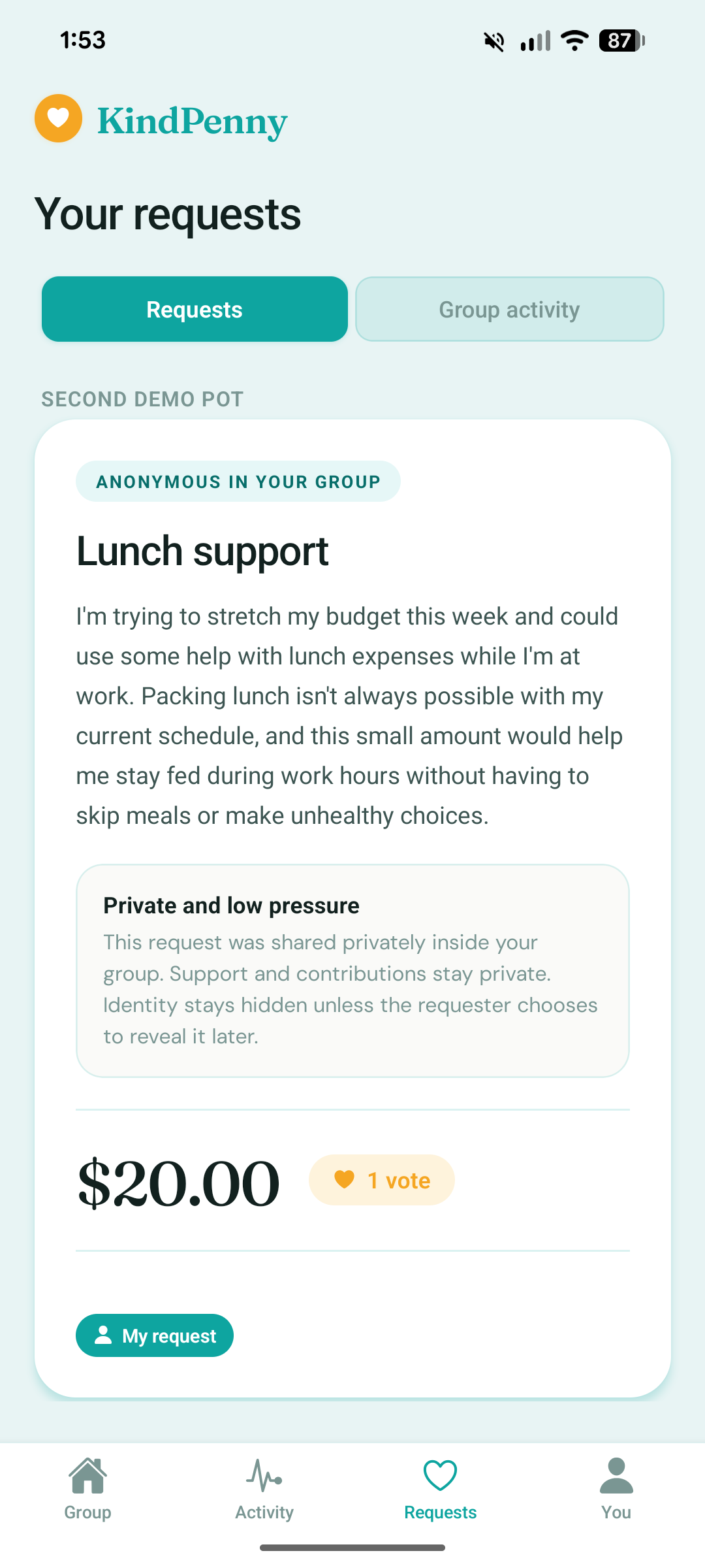 KindPenny is a simple way for an invite-only small group — friends, family, or co-workers — to pool small contributions and fulfill real requests. No downvotes. No rejection mechanics. No race for attention.