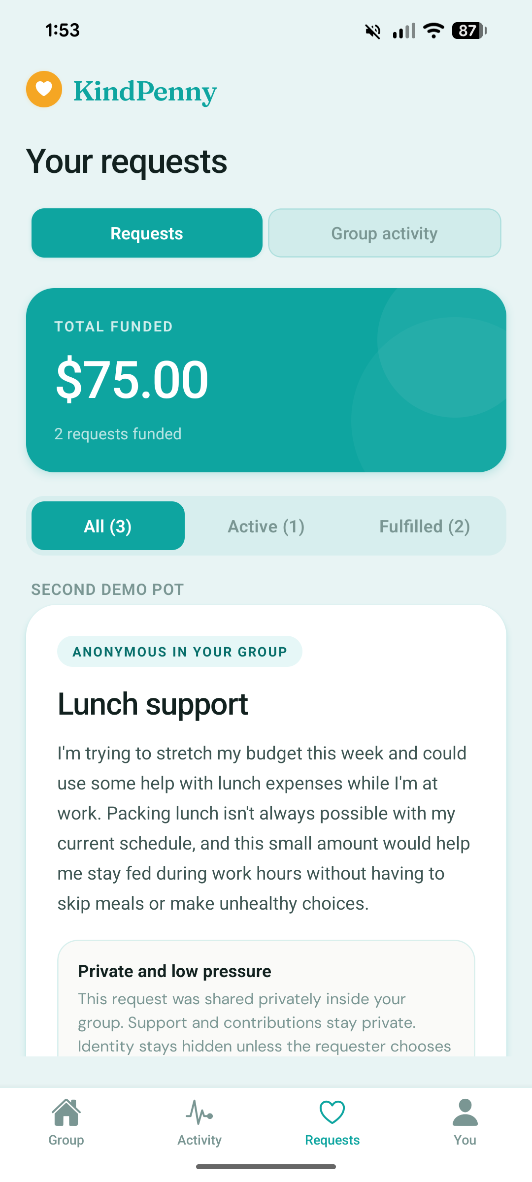 This is the moment that should feel obvious: your group supports a request, the pot reaches the amount, and the request is fulfilled. That is the product.