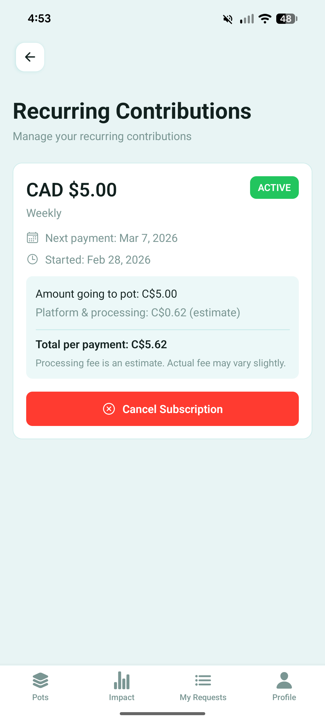 When the pot balance changes, KindPenny checks the highest-supported eligible request. If the pot can cover it, it is fulfilled automatically.